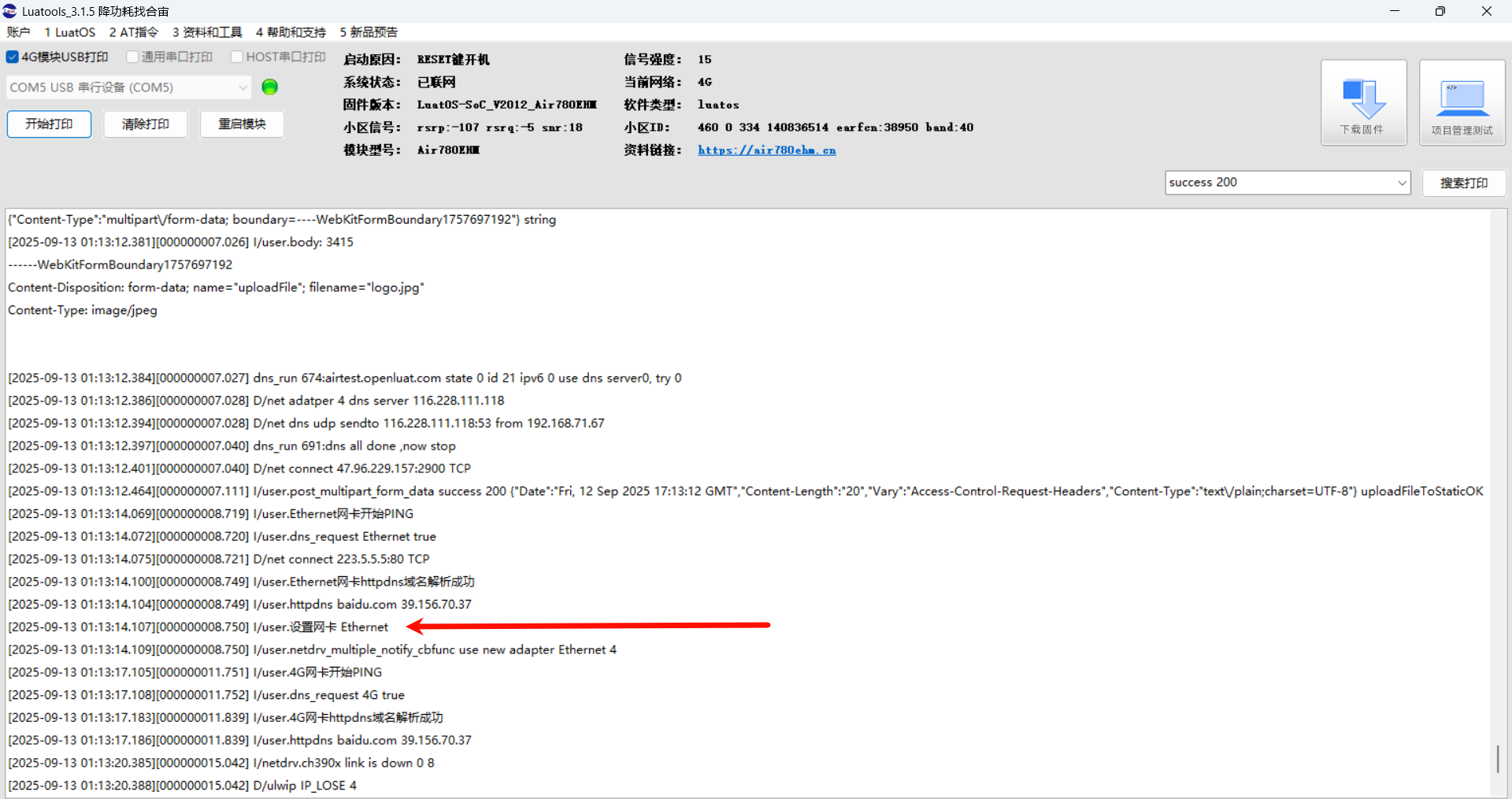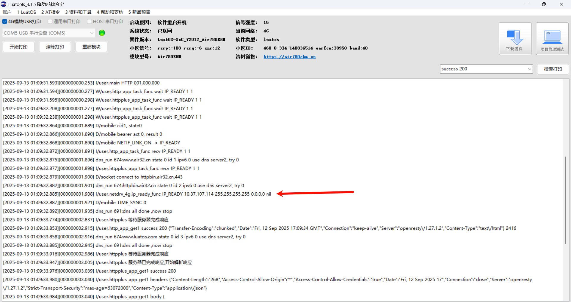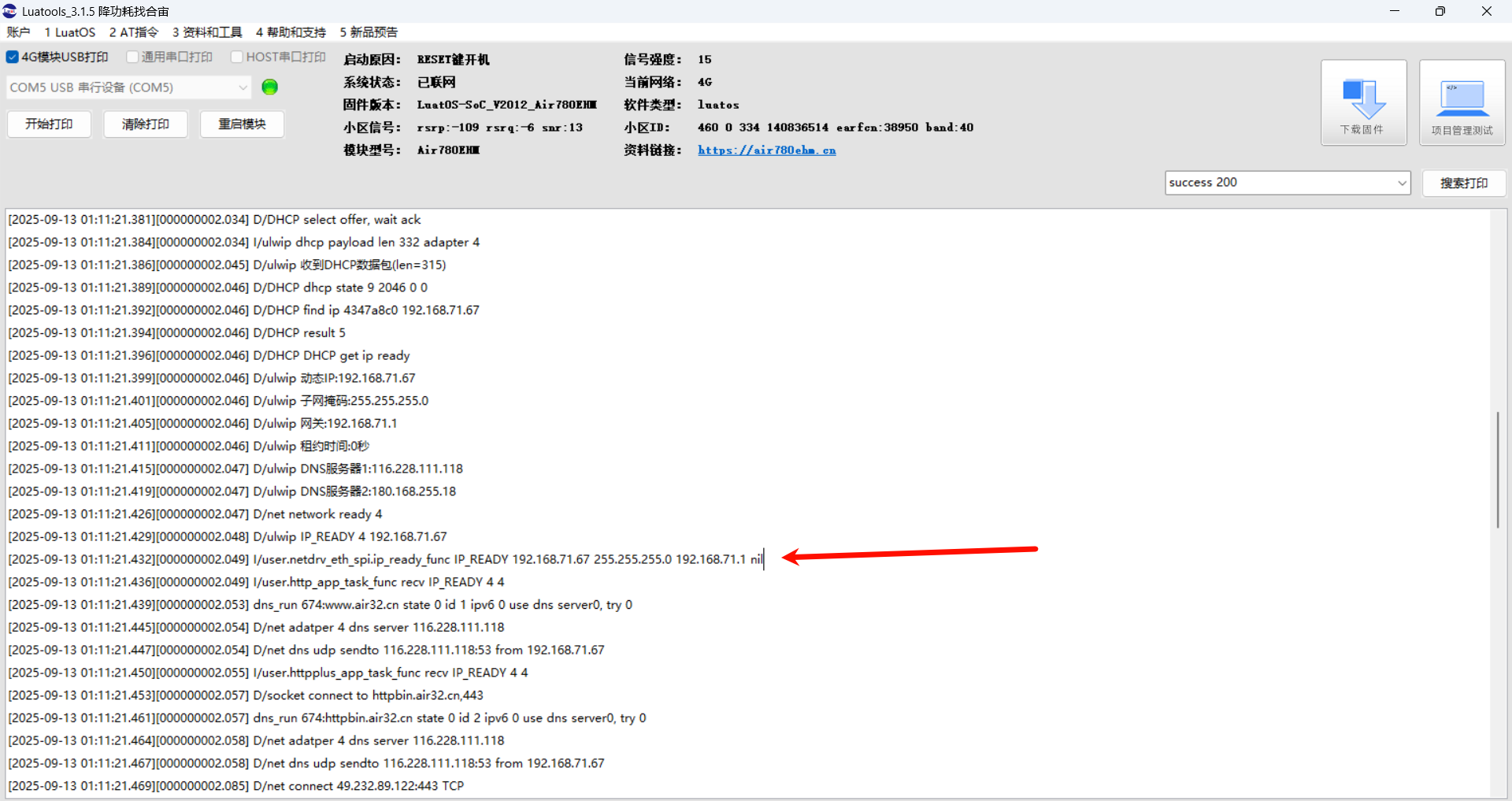 如出现类似 I/user.netdrv_eth_spi.ip_ready_func IP_READY 192.168.71.67 255.255.255.0 192.168.71.1 nil