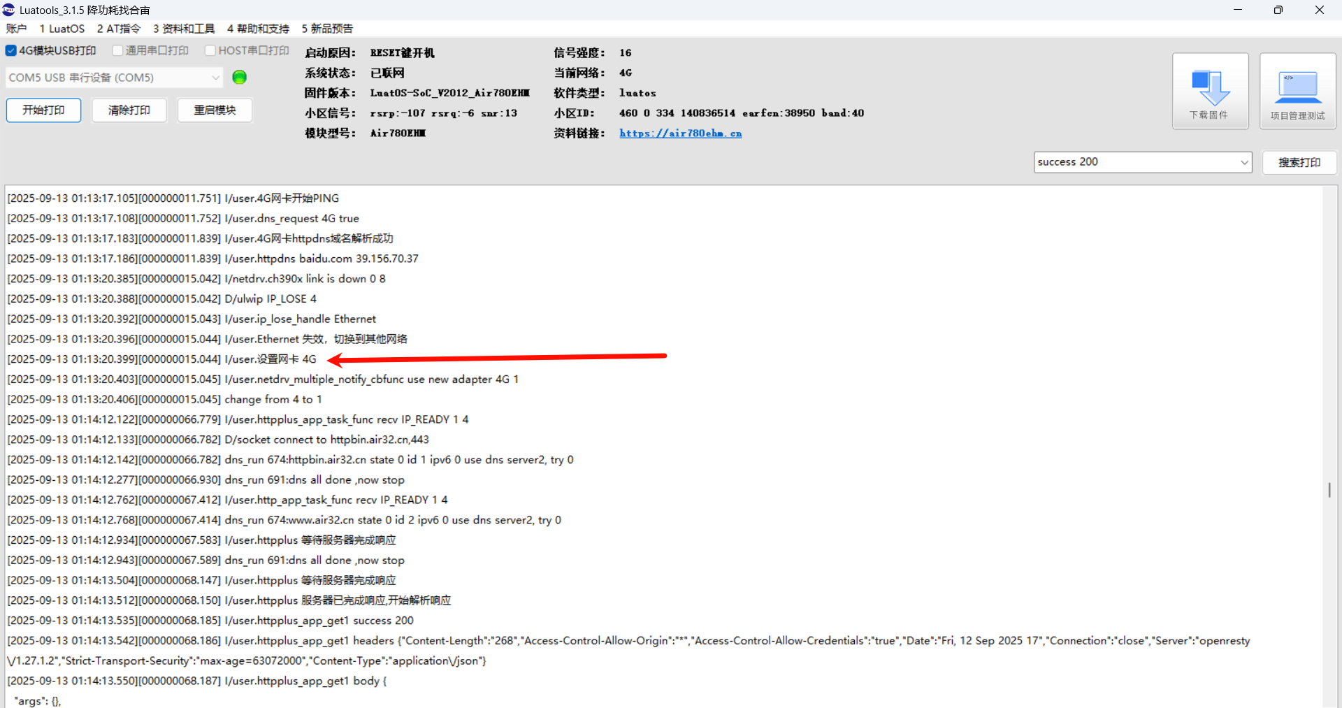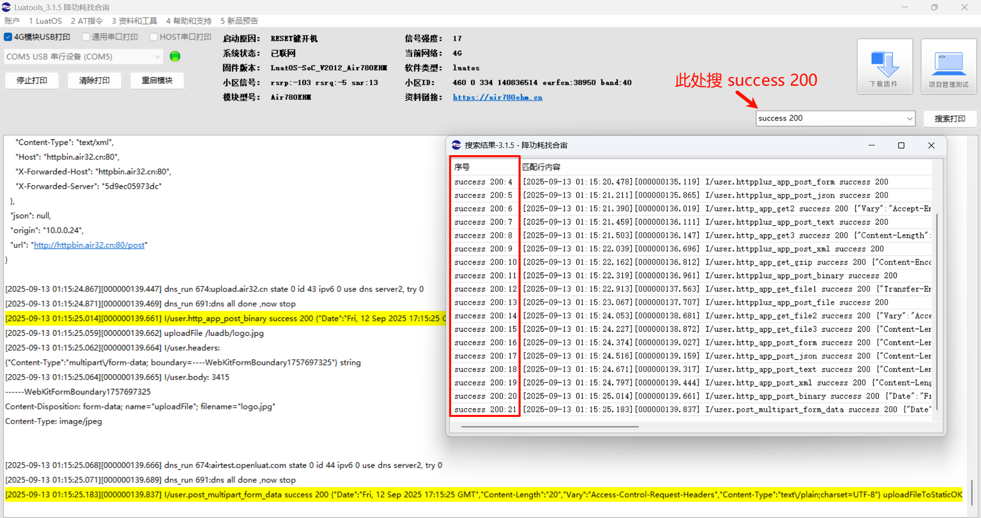 前面介绍了 HTTP 核心库演示模块中演示了 13 种场景的 HTTP 请求,HTTPPLUS 扩展库演示模块中演示了 9 种 HTTP 请求。因此我们烧录程序成功后,在日志中搜索 success 200
