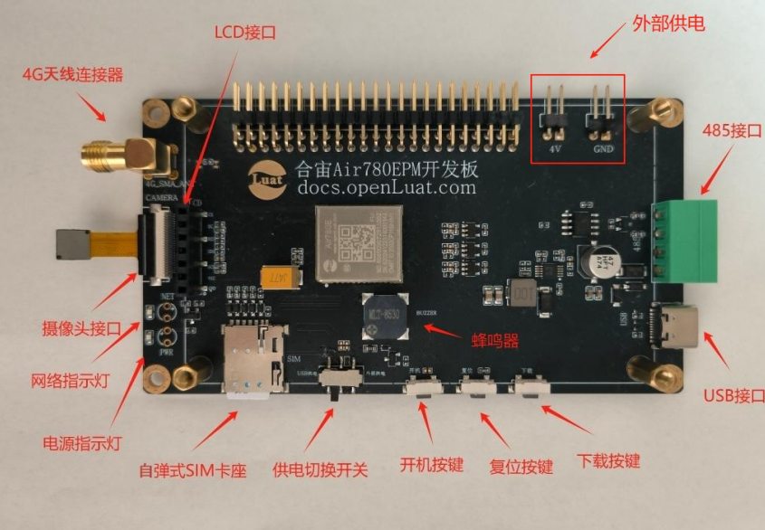 参考:硬件环境清单第二章节内容,准备以及组装好硬件环境,本篇文档使用的是 Air780EPM 整机开发板,如下图所示: