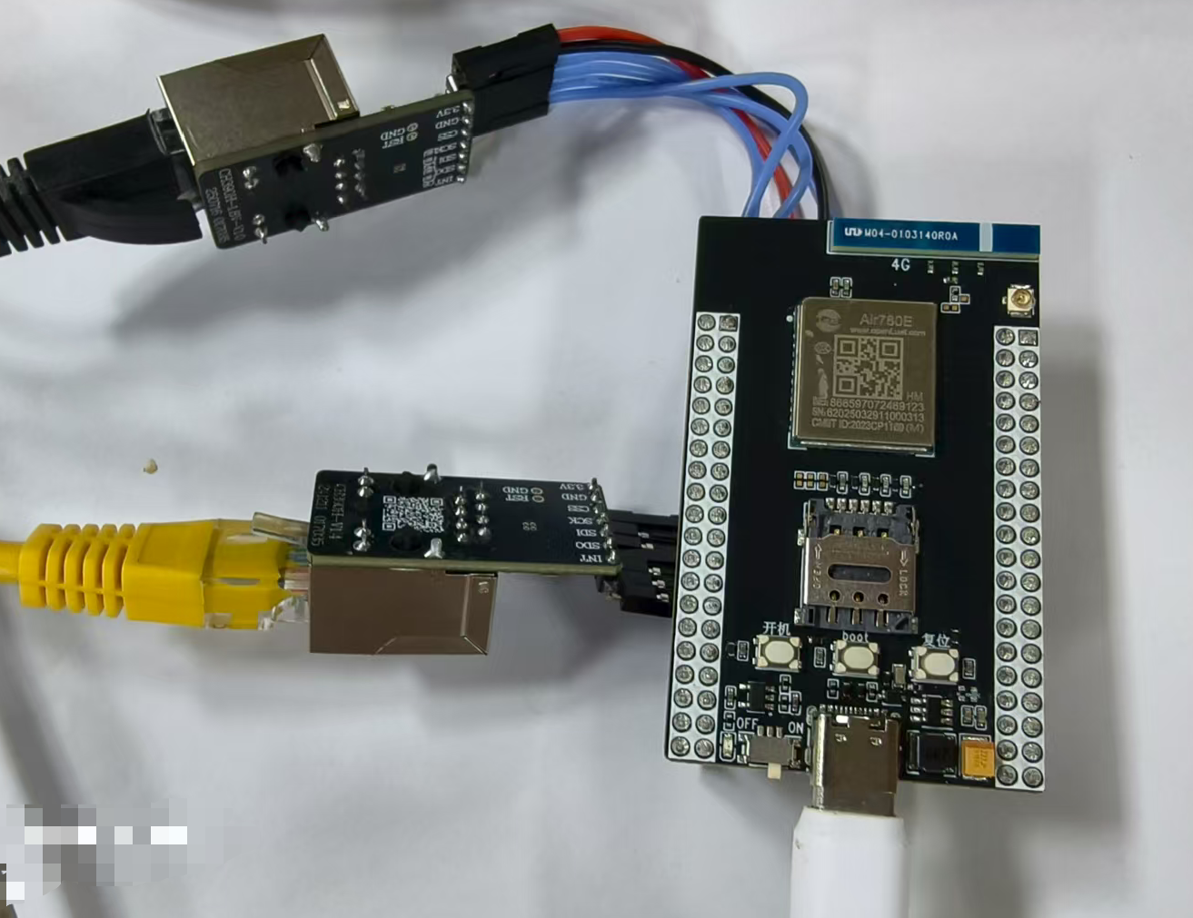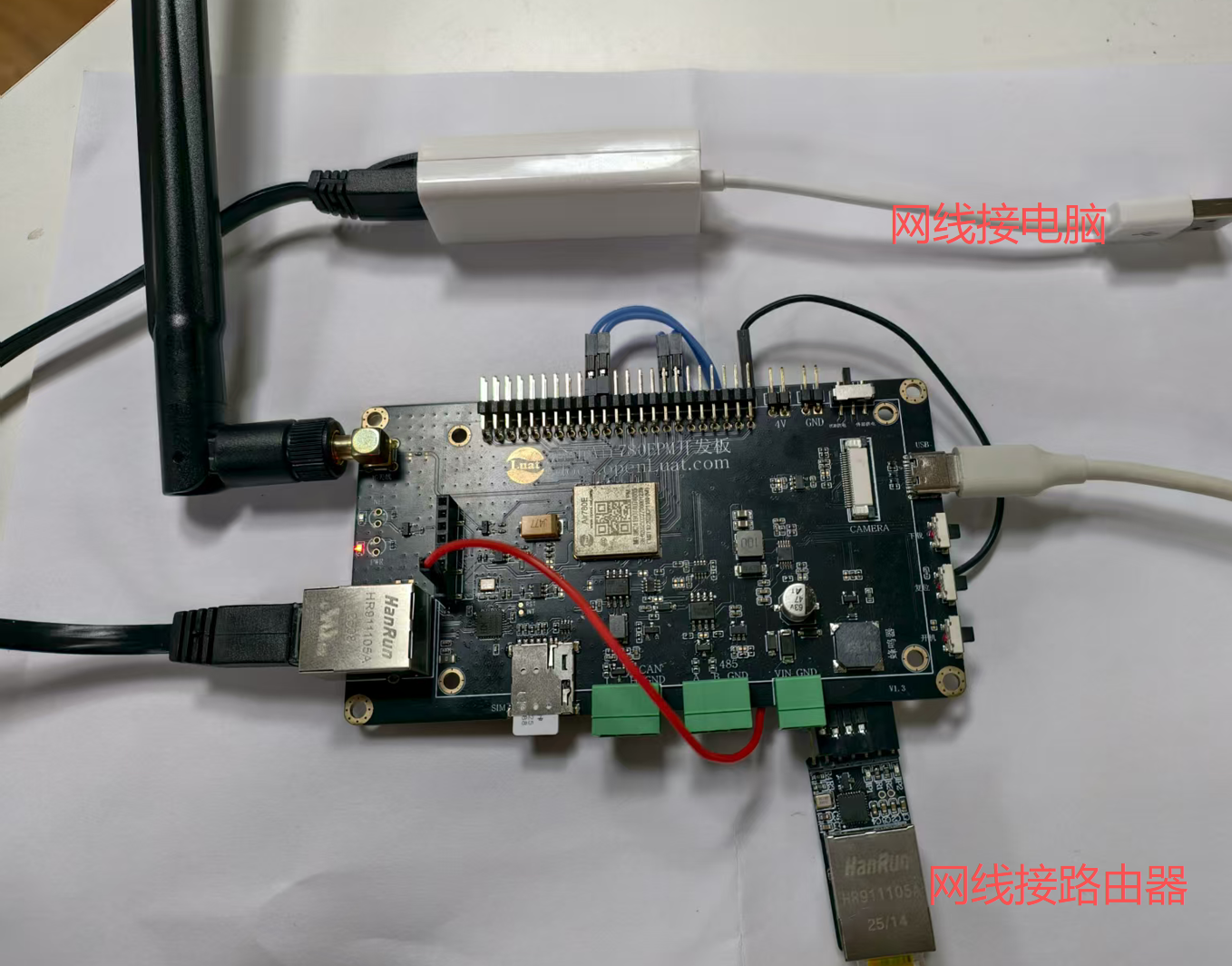 2.2.1 Air780EHM 核心板一块 + 可上网的 sim 卡一张 +4g 天线一根 + 网线两根: