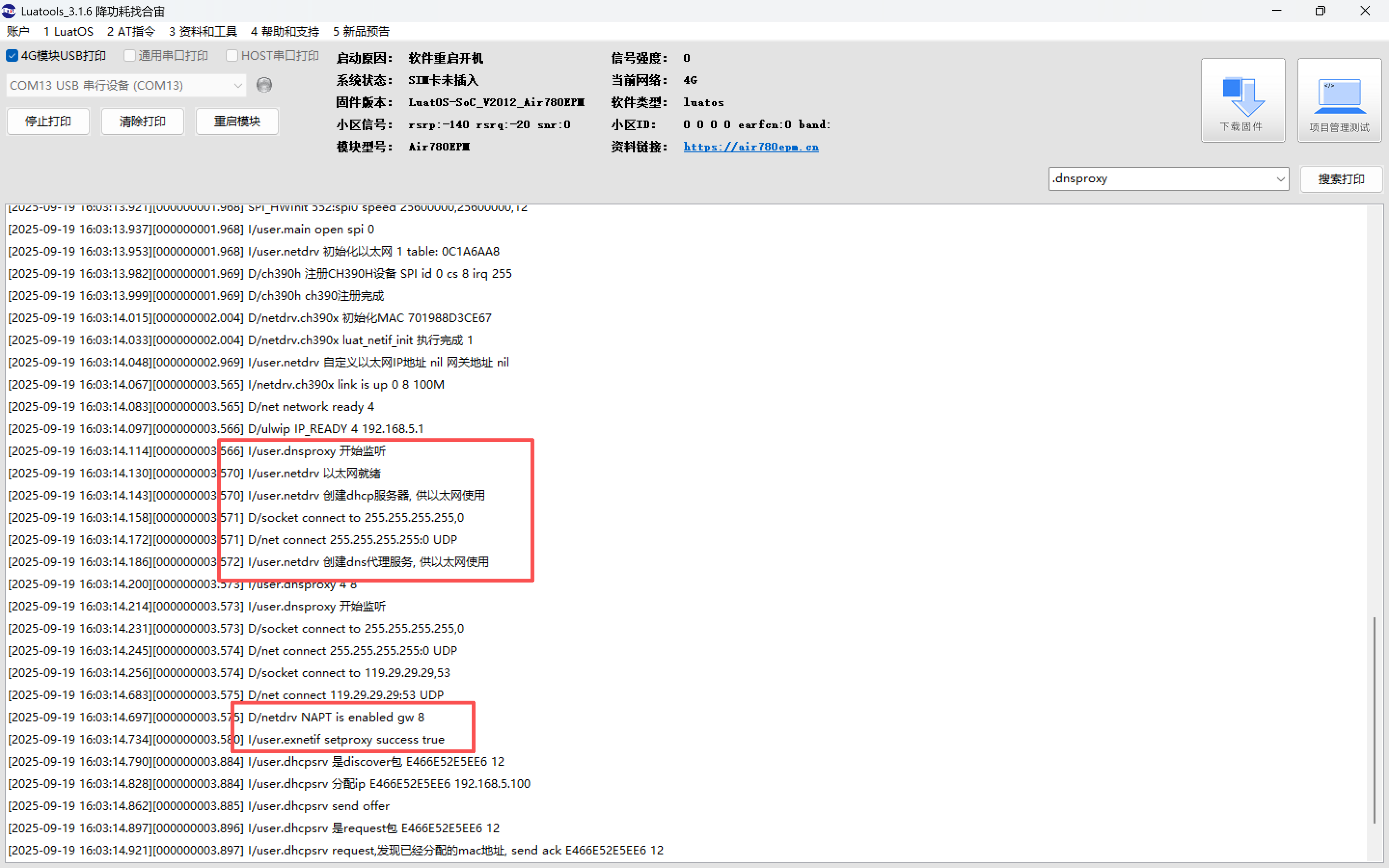 以 4G 为供网数据出口,通过 Air780EPM 模组实现以下功能: