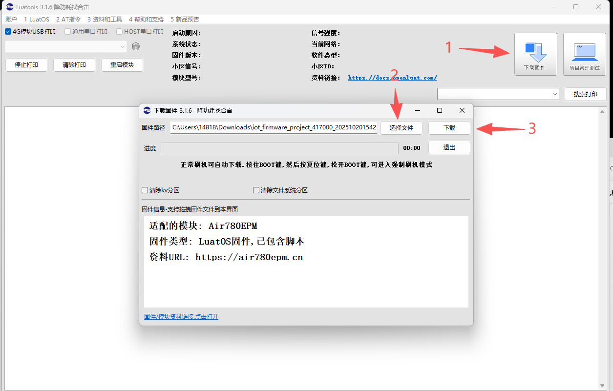 接着打开 luatools 工具,并点击下载固件,放入设备需要烧录的固件后点击下载,如果不会烧录,可以参考 LuaTools 下载调试教程