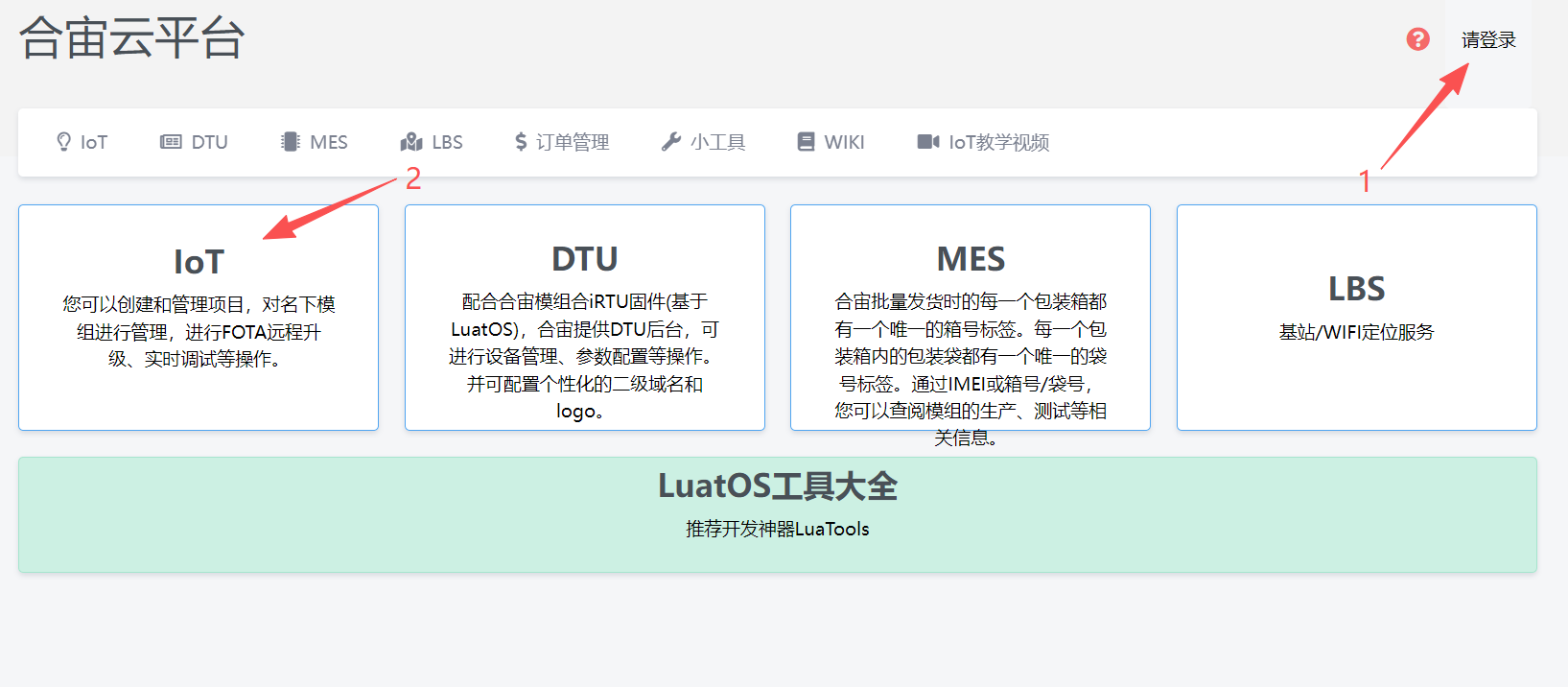 首先,需要登陆我们的合宙云平台 由此进入,并进入 IOT 管理页面