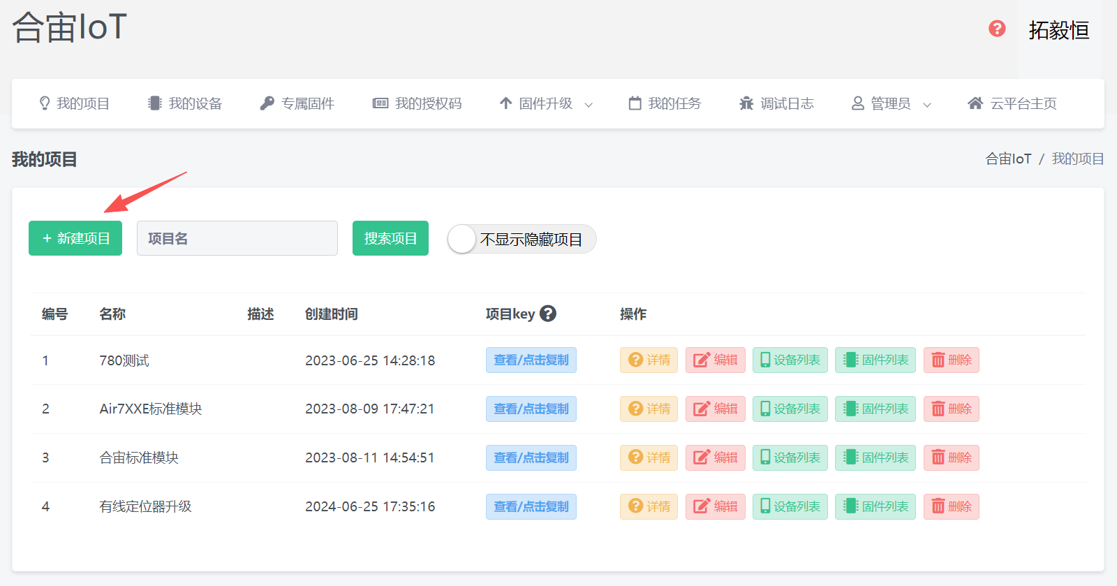 登录后点击新建项目,创建一个项目,以便后续将设备归属到此项目中来管控