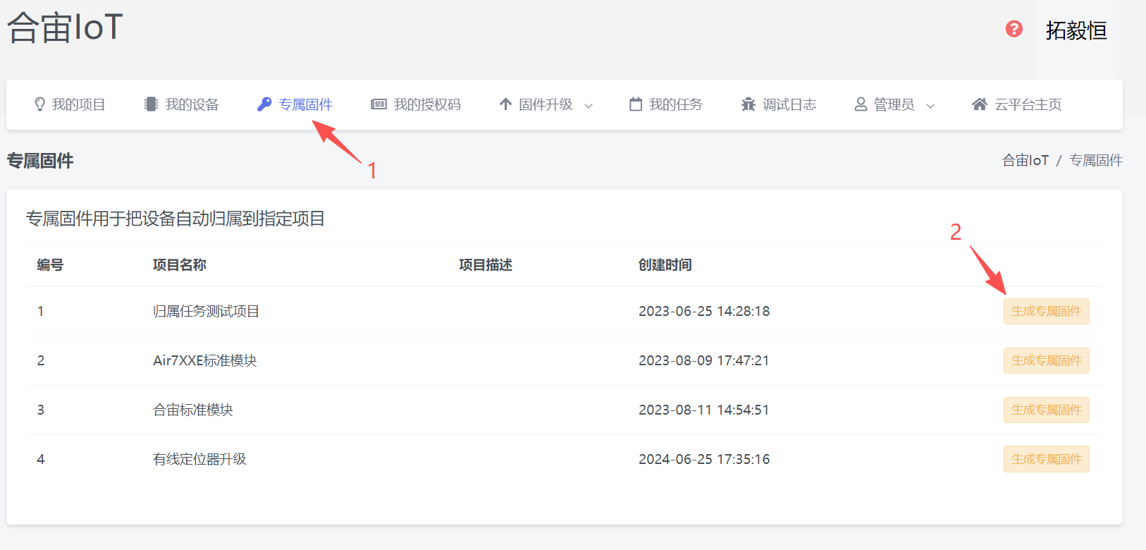 接下来开始进行归属操作,首先点击专属固件,生成我们需要归属项目的专属固件