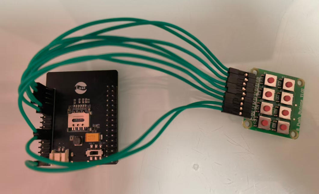 Air8000核心板+AirKEY_1000配件板,使用Air8000核心板的GPIO中断检测AirKEY_1000配件板上8个独立按键的按下或者弹起状态;