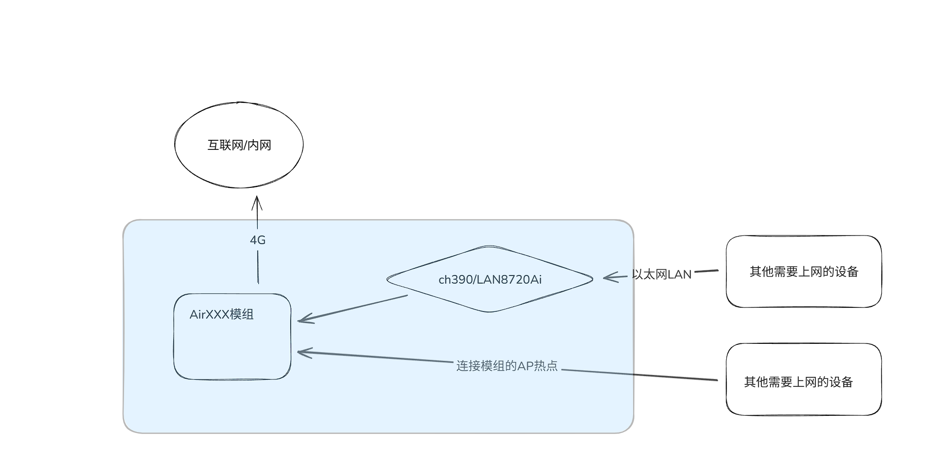 本文基于 Air8000 模块,通过 4G 移动网络为 WiFi 和以太网设备提供统一的上网接入服务。
