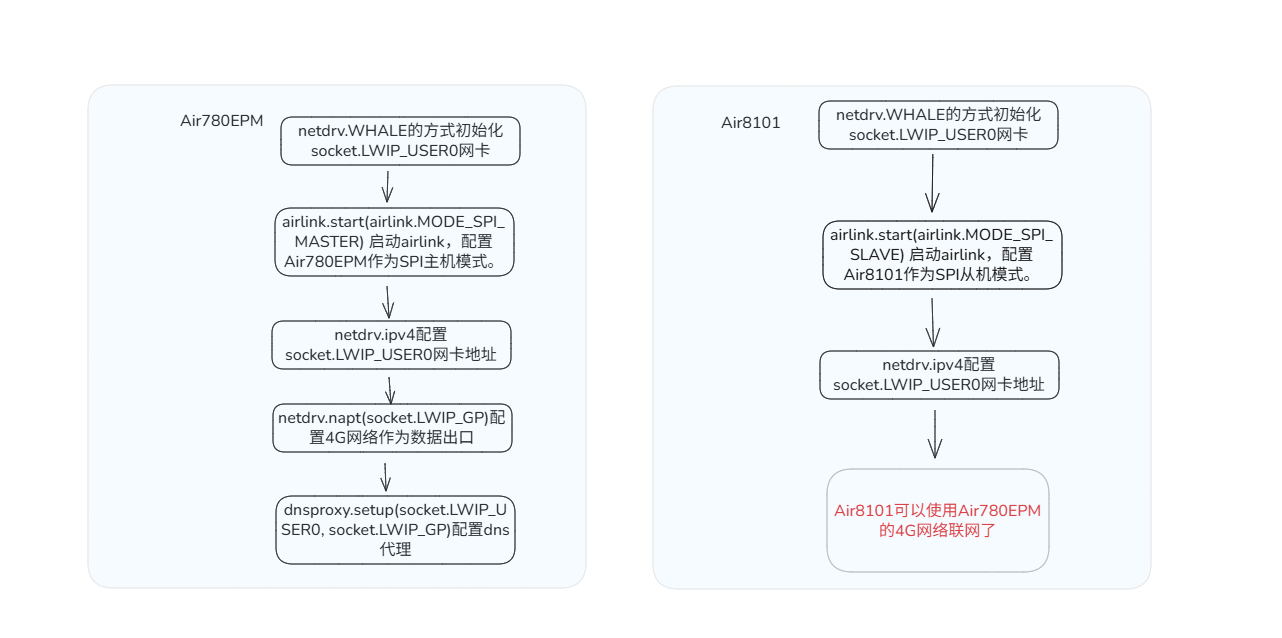 - 通过 airlink 实现多网融合功能:通过 spi 或 uart 方式连接两台设备;