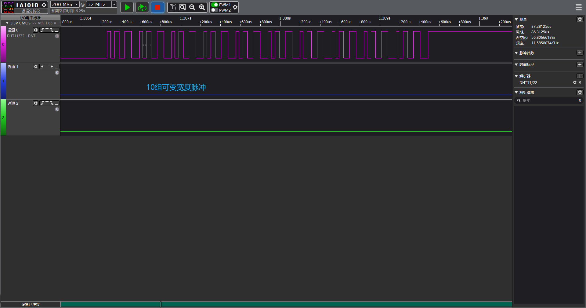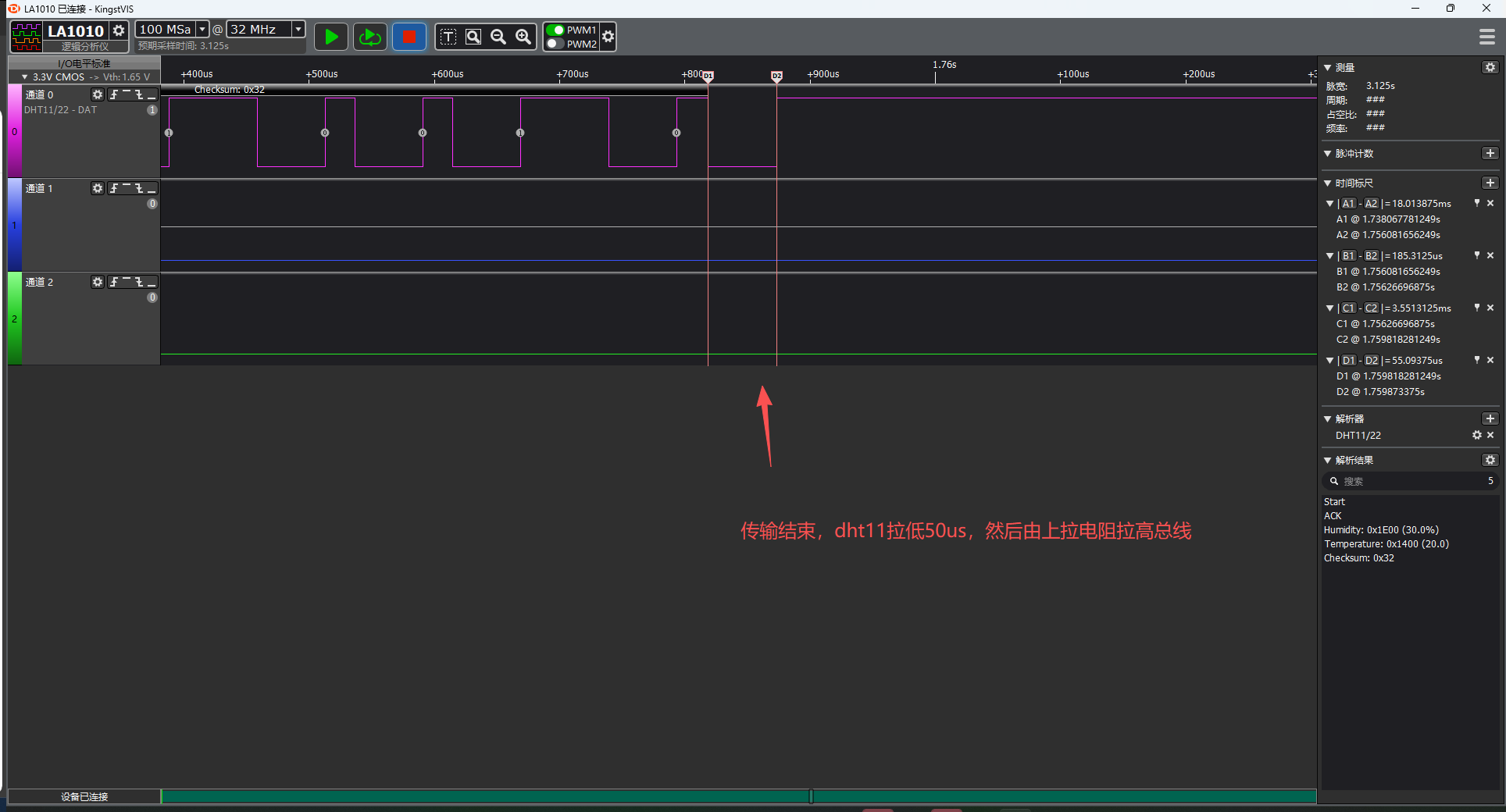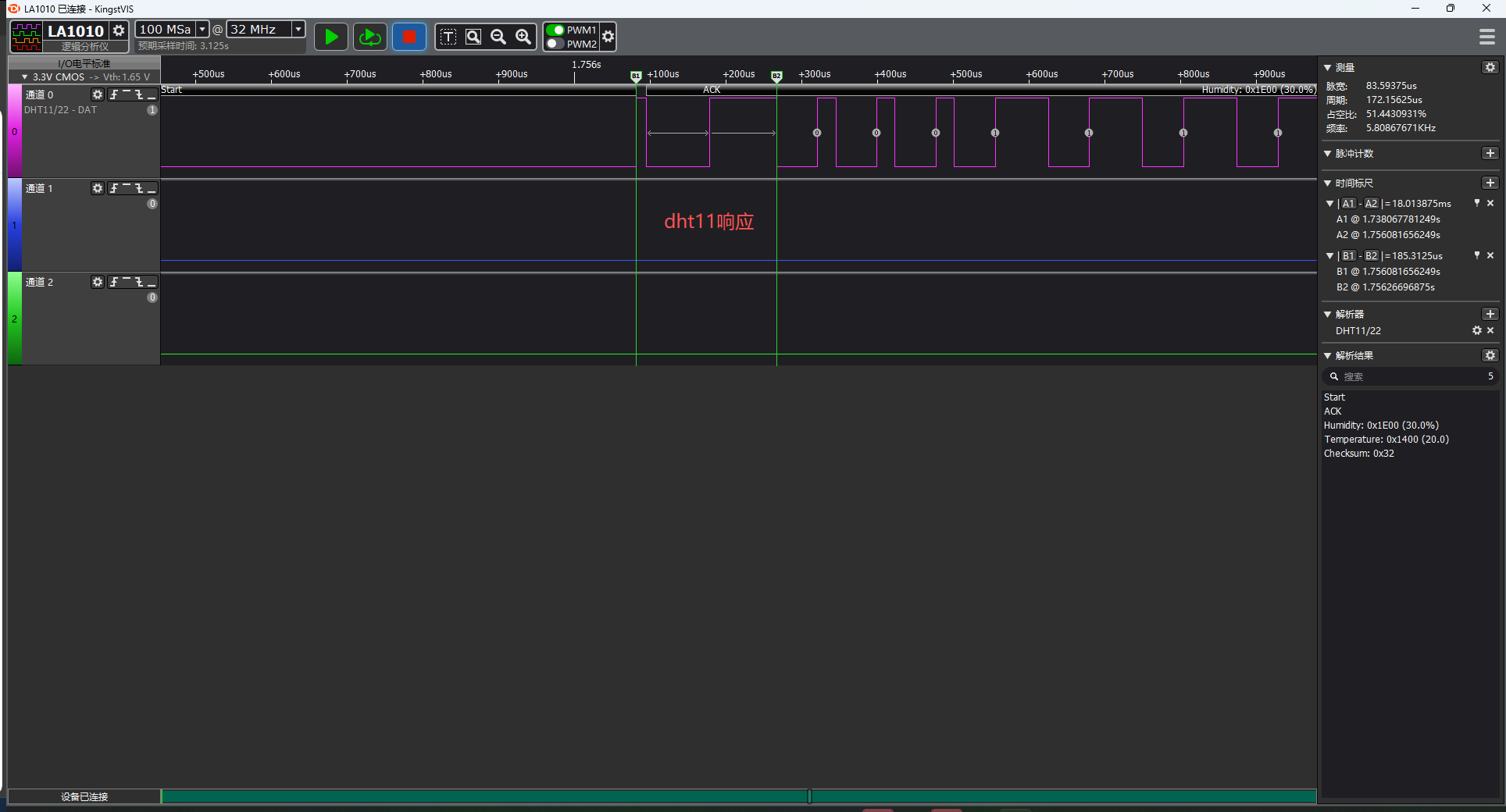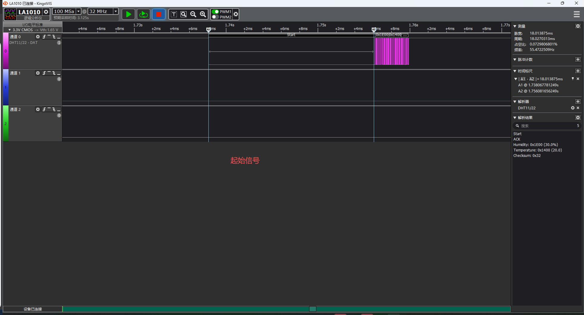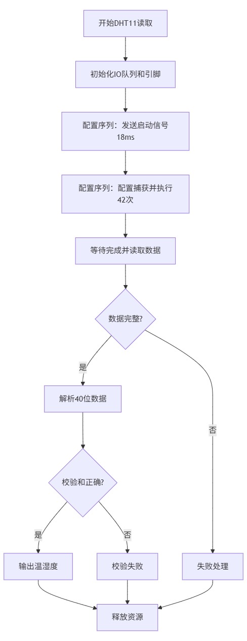 下面演示使用硬件定时器精确控制 DHT11 通信时序,通过捕获下降沿时间戳解码温湿度数据,实现微秒级精确通信: