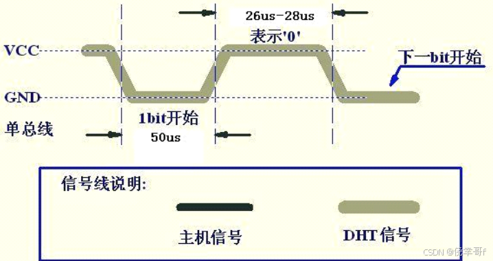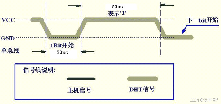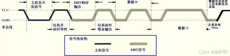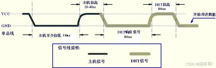 - 起始信号:总线空闲状态由 DHT11 内置上拉电阻拉高,主机拉低总线至少 18ms 后释放总线 20-40us