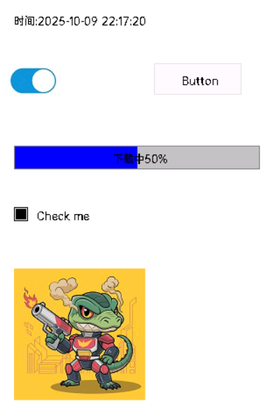 - 主要组件:Button、Label、ProgressBar、MessageBox、Picture、CheckBox、Window。